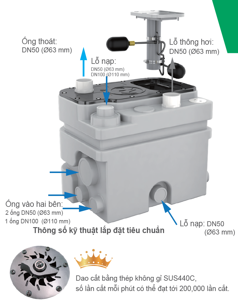 Phù hợp cho các biệt thự cao cấp, trung tâm mua sắm, siêu thị, khách sạn, nhà hàng, ga tàu điện ngầm, bãi xe và những nơi không thể xả nước thải theo trọng lực. Lắp đặt trong môi trường không có hố thu